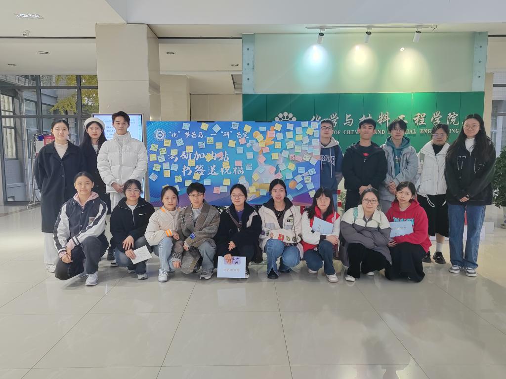 会前,老师和同学们准备充分,精心布置场地、准备礼包,同学们在明信片上写下祝福,为考研学子加油鼓劲,表达最诚挚的祝愿:“千淘万漉虽辛苦,吹尽狂沙始到金”、“星光不问赶路人,我们一‘研’为定”、“念念不忘,必有回响,此战必胜,金榜题名”……一字一句满载真心,一笔一划勾勒愿景。考研之路漫漫,衷心的祝福陪伴学子不断前行,化工楼大厅布置“化”梦为马,一“研”为定祝福展板,来往同学及工作人员们手写便利贴,为考研学子加油助力,五颜六色的便签承载着学院师生的期愿,一份祝福一份温情,化成冬日的柔柔暖意。行程万里,温暖相伴,这一路虽日夜兼程,球友会大家庭永远是莘莘学子坚实的后盾。